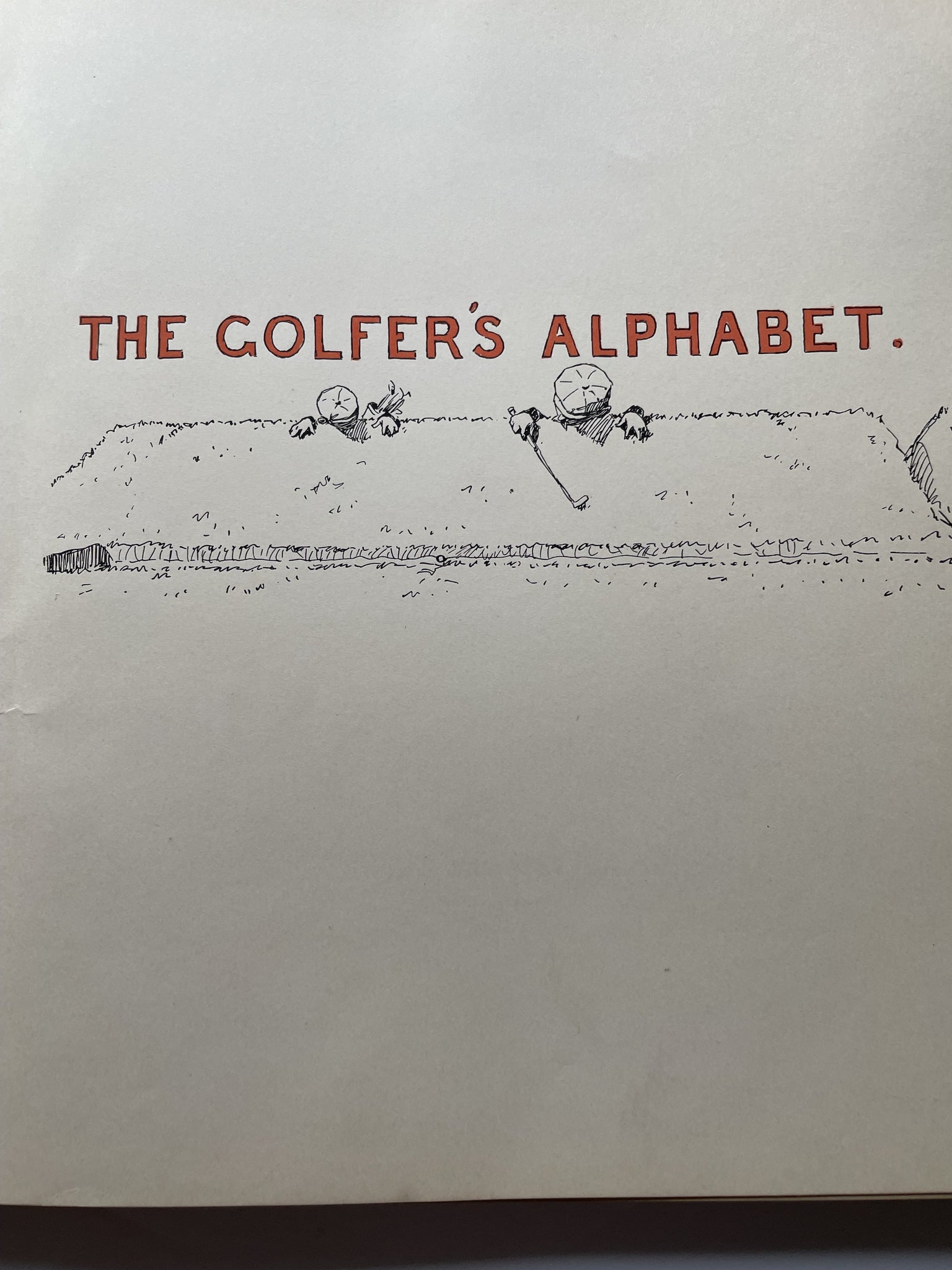 A humorous book written by Sutphen and illustrated by noted American artist A.B. Frost, usual wear to board edges, internally the book is clean and bright. The book was issued unpaginated, but there are 112 pages present as the reference sources indicate there should be. Hinges are a bit tender. Murdoch 751. Donovan & Jerris S42250. book of cleverly conceived couplets which convey a thought for each letter of the alphabet, for example: "N" is for Niblick, retriever of blunders, and now and again, it accomplishes wonders".